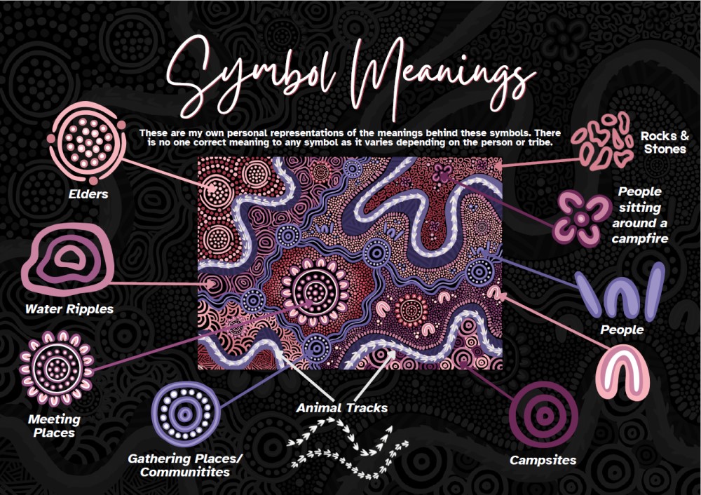 Animal Tracks, mountains, stones and and water ripples flow across the piece, representing courage, communication, and ARIIA’s willingness to try new ways of thinking. These tie the artwork back to Country, reminding us that care and connection are deeply rooted in people, place and culture. The inclusion of the water and land elements emphasises sustainability, growth, and the interdependence of all communities.